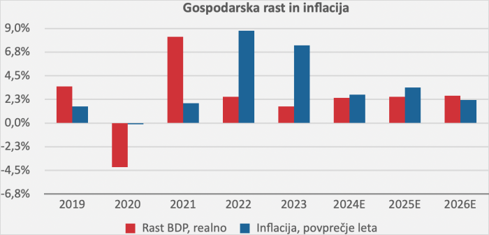 Pomladanska analiza za leto 2024, ki jo je izdal Urad RS za makroekonomske analize in razvoj (UMAR), predvideva, da se bo gospodarska rast v Sloveniji letos okrepila s 1,6 % na 2,4 %. Ta napoved je nekoliko nižja od jesenskih pričakovanj, ki so znašala 2,8 %. Vzroki za to rast vključujejo nadaljnjo rast investicij, umirjanje inflacijskih pritiskov in počasnejše, a pozitivno okrevanje tujega povpraševanja. Izvoz blaga naj bi se okreval po prejšnjem zmanjšanju, pričakuje pa se tudi rahlo višja rast dodane vrednosti v predelovalnih dejavnostih, zlasti zaradi turizma povezane rasti izvoza storitev. Povečani domači stroškovni pritiski, zlasti stroški dela, pa lahko omejijo rast v izvoznem sektorju zaradi poslabšane konkurenčnosti.